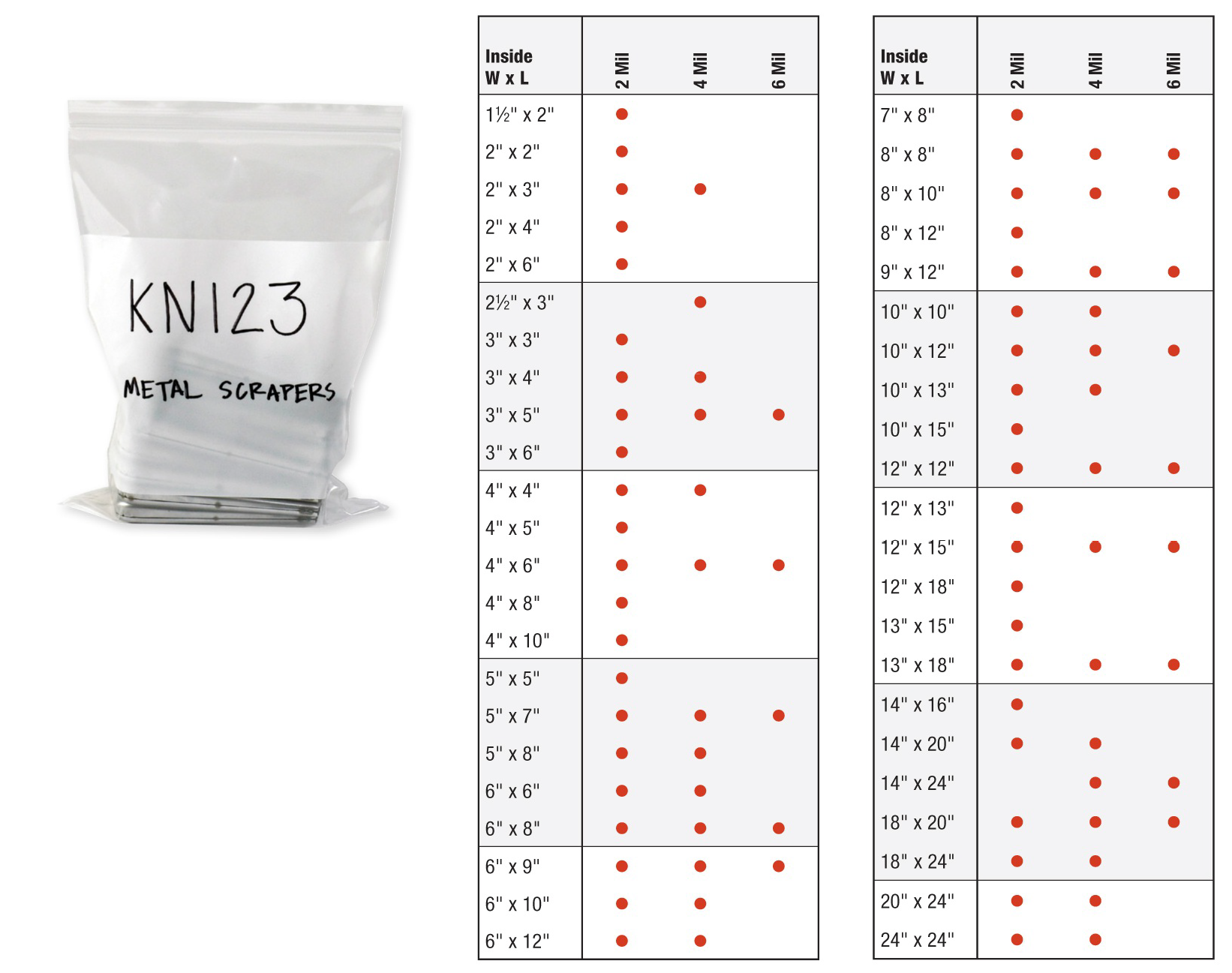 Sizes listed are inside dimensions of the bag.